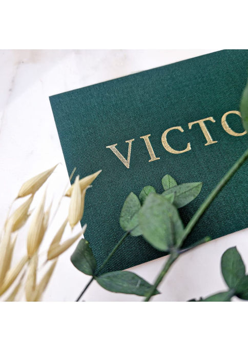 Een kaart met op de voorzijde echte linnen, bedrukt met ambachtelijke folie of letterpress dieper in de kaart.